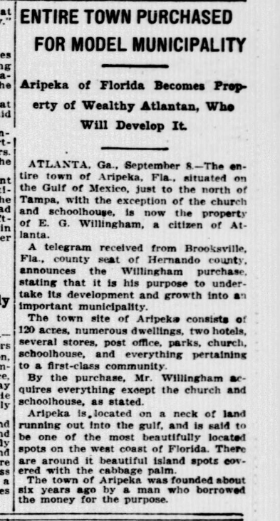The entire town of Aripeka, Fla., situated on the Gulf of Mexico just to the north of Tampa, with the exception of the church and school house, is now the property of E. G. Willingham, a well-known citizen of Atlanta.
